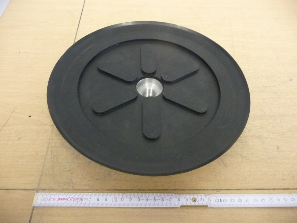 Saugplatte Typ BLSP 290 BR, M22x1,5 Der Flachsauger besteht aus NBR, ist schwarz und hat ein Durchmesser von Ø 290 mm. Die Aluminium-Grundplatte hat ein M22x1,5 Innengewinde. Die Dichtung ist mit einem Spannband auf der Grundplatte gesichert BLSP.292.111.001 B000939