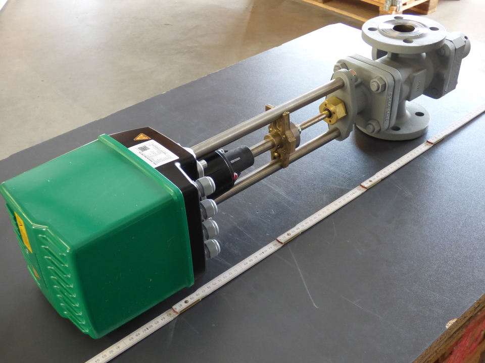 Motorregelventil - Baureihe MV 5391-P in Durchgangsform, mit Pumpenfreilauf Nennweite DN 40, Nenndruck PN 40 Gehäusewerkstoff Stahlguss EN-GP-240-GH Flansche mit Dichtfläche nach DIN Spindelabdichtung: Dachmanschetten PTFE/Kohle, Kennlinie/Anström.: gleichprozentig/auf den Kegel,Lochkegel mit 10 % Freilauf, gehärtet (metallisch dichtend) ,Kvs-Wert = 7,6 m³/h, Hub 30 mm, Sitzdurchmesser 32 mm, Oberflächenbehandlung mit Zinkstaubgrundierung CE-Kennzeichnung gemäß Druckgeräterichtlinie (PED), max. zulässiger Druck nach DIN EN 1092 , max. zulässige Temperatur TS 200 °C, Elektrischer Stellantrieb - Typ REact 60E-090, Stellkraft 6 kN, einschließlich Handverstellung, Wechselstrommotor 230 V, 50/60 Hz, Stellgeschwindig KTR